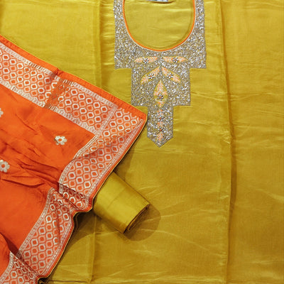 Yellow Base Handwork On Kurta With Orange Dupatta Full Suits Set