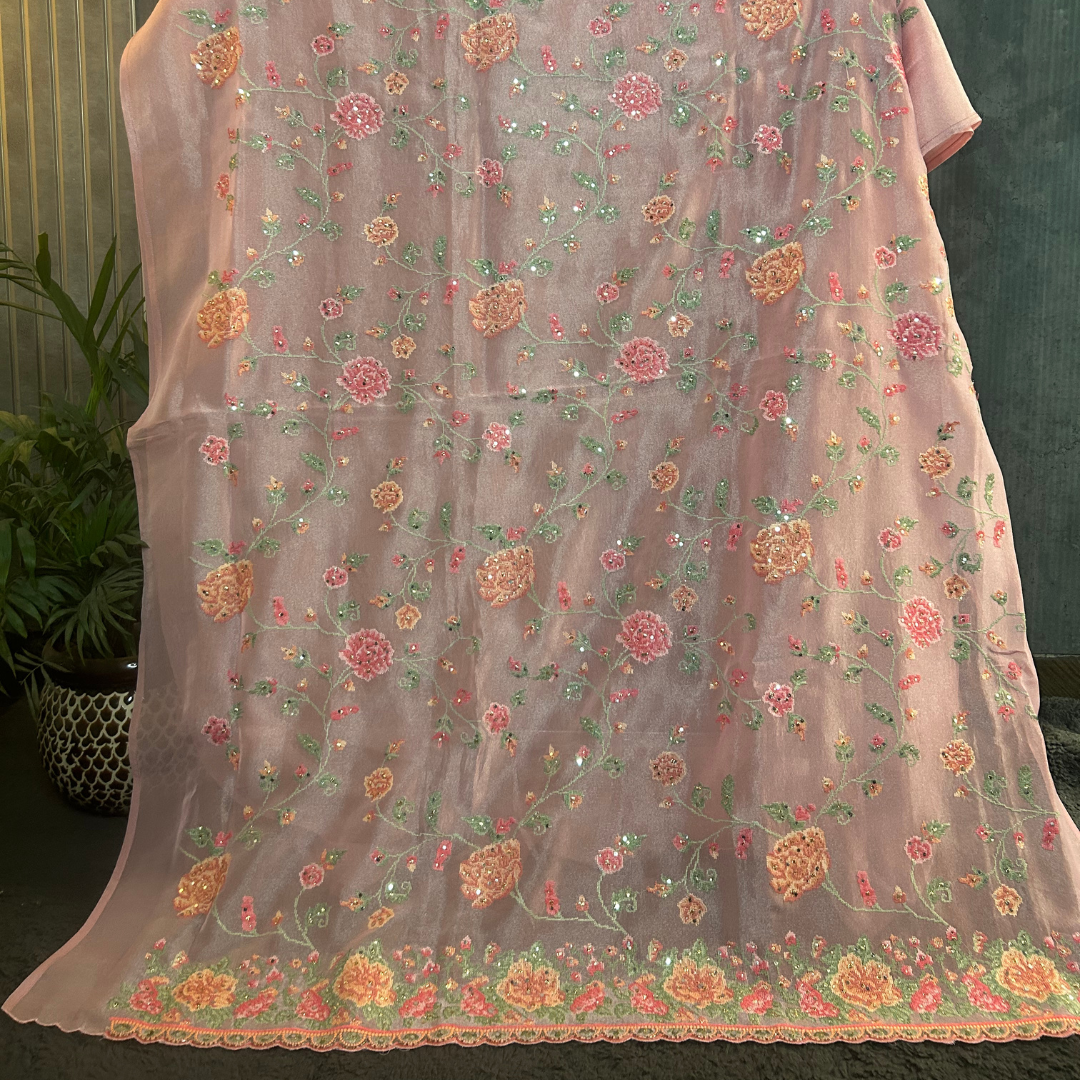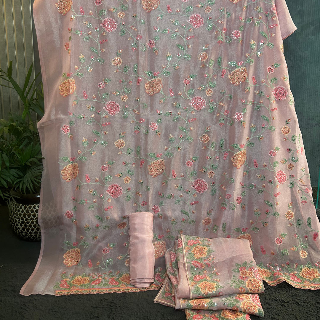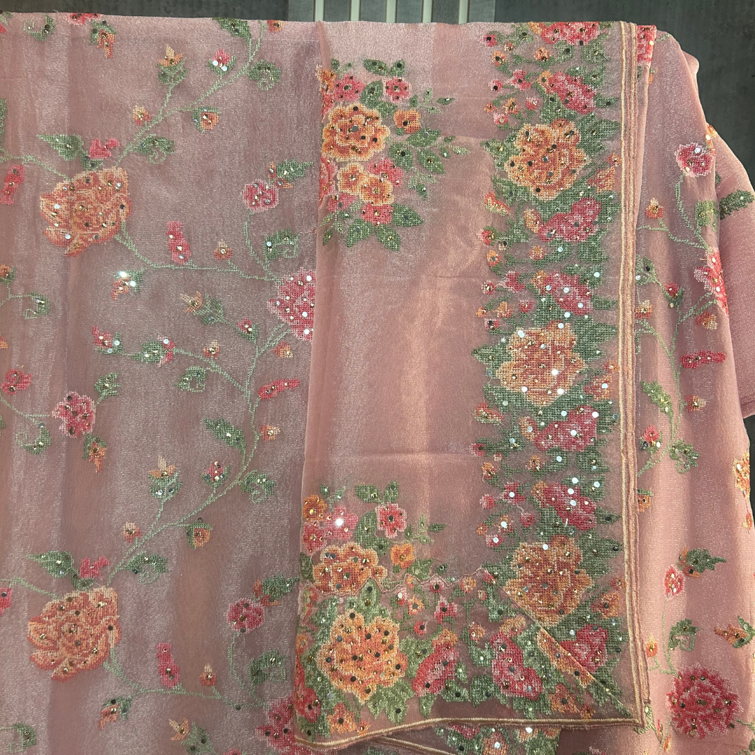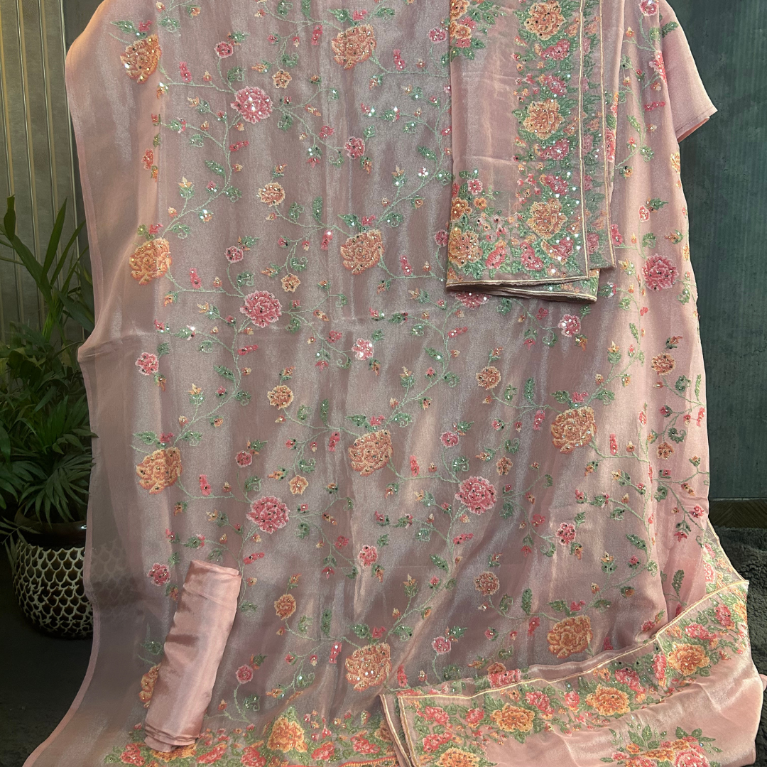 Organza Tissue Kurta Set with Cross Stitch Sequin Handwork & Upadda Silk Bottom