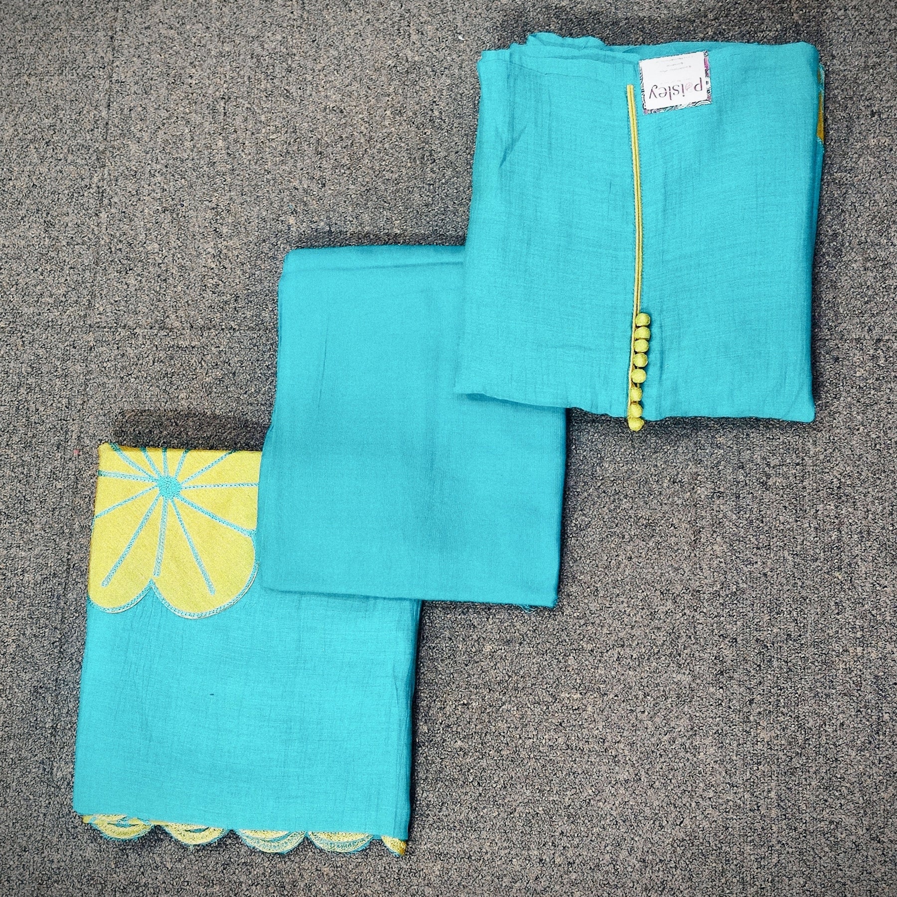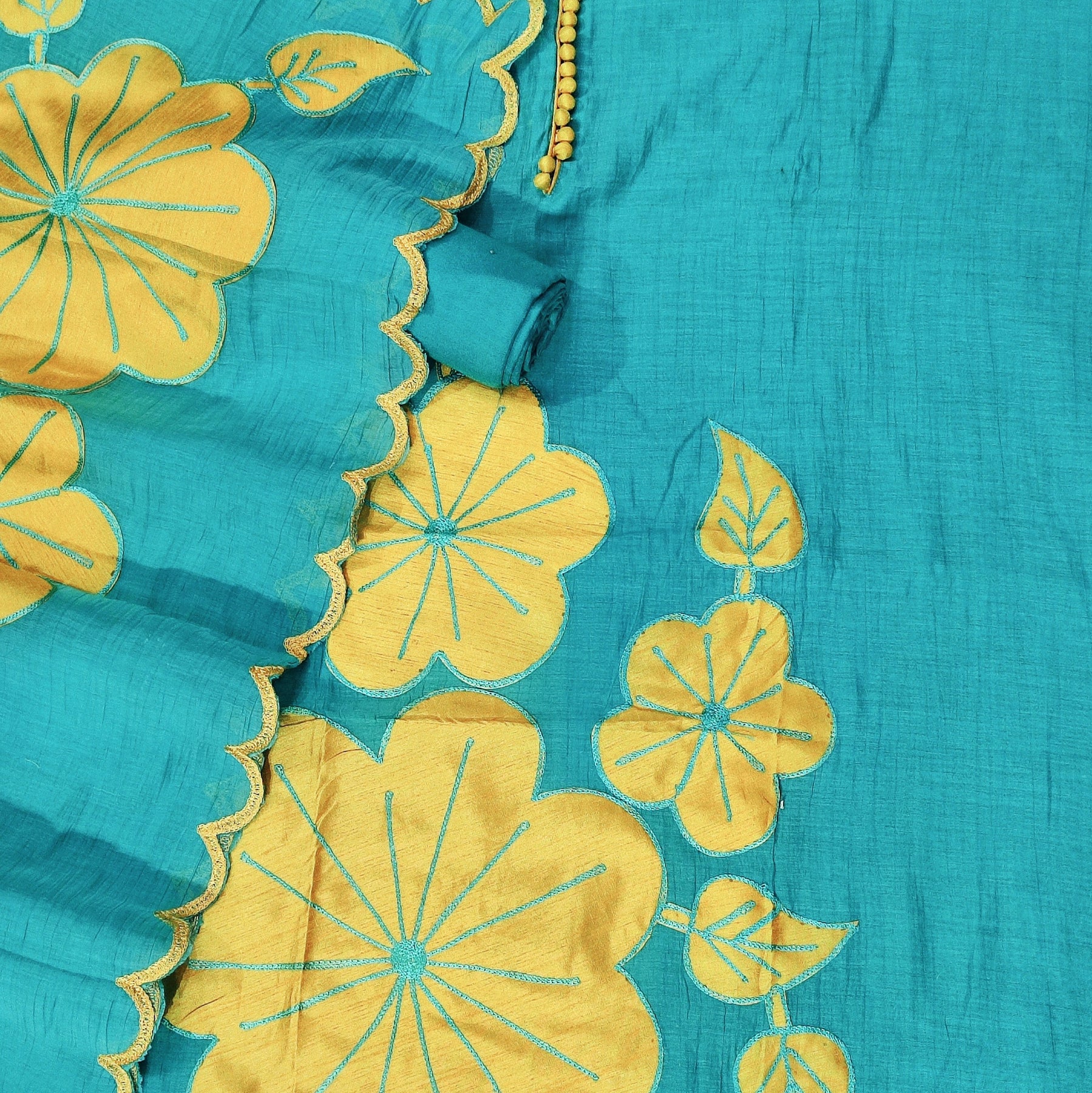 Firozi Base Neon Green Applique Work On Kurta And Dupatta Full Suits Set