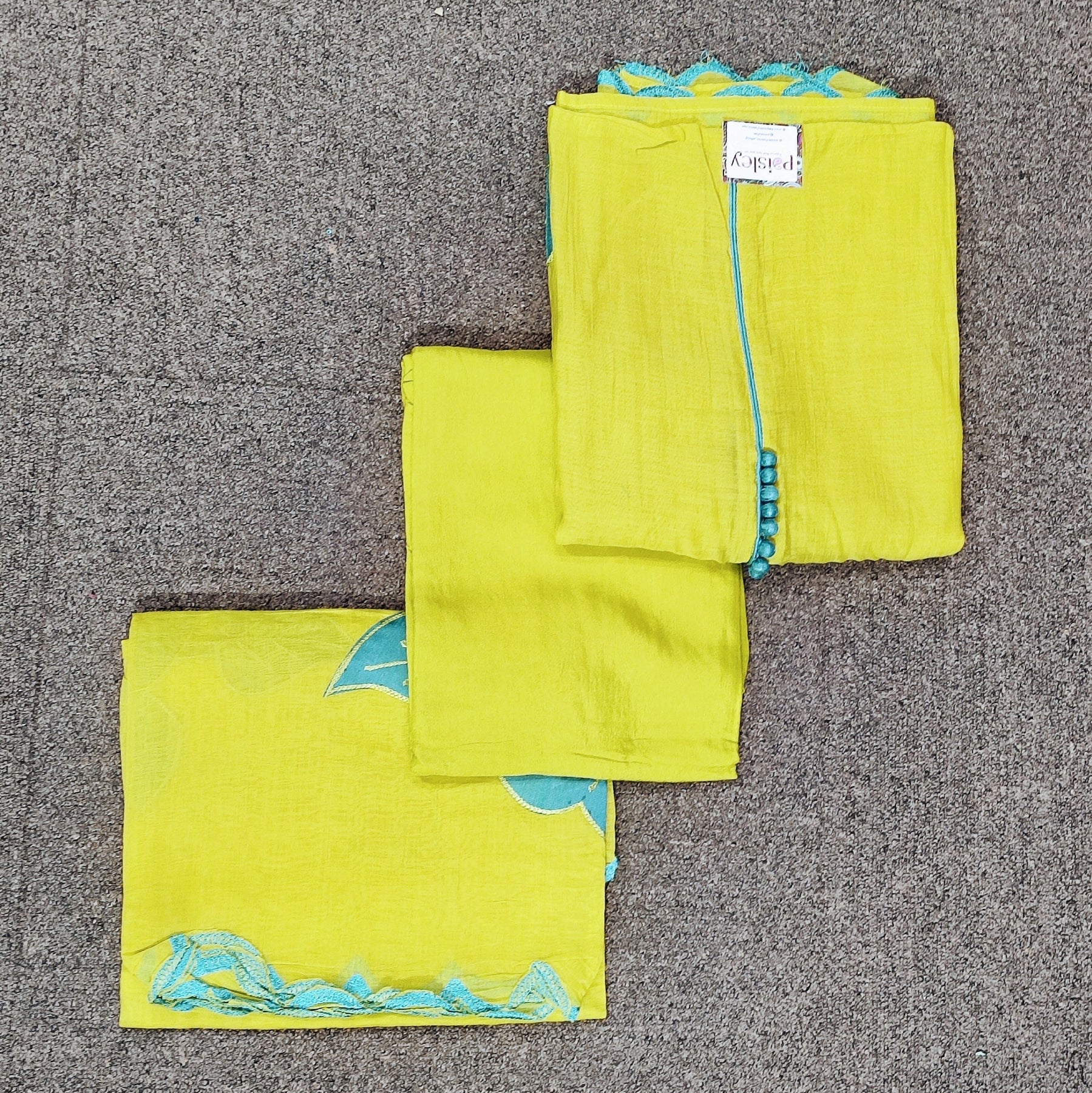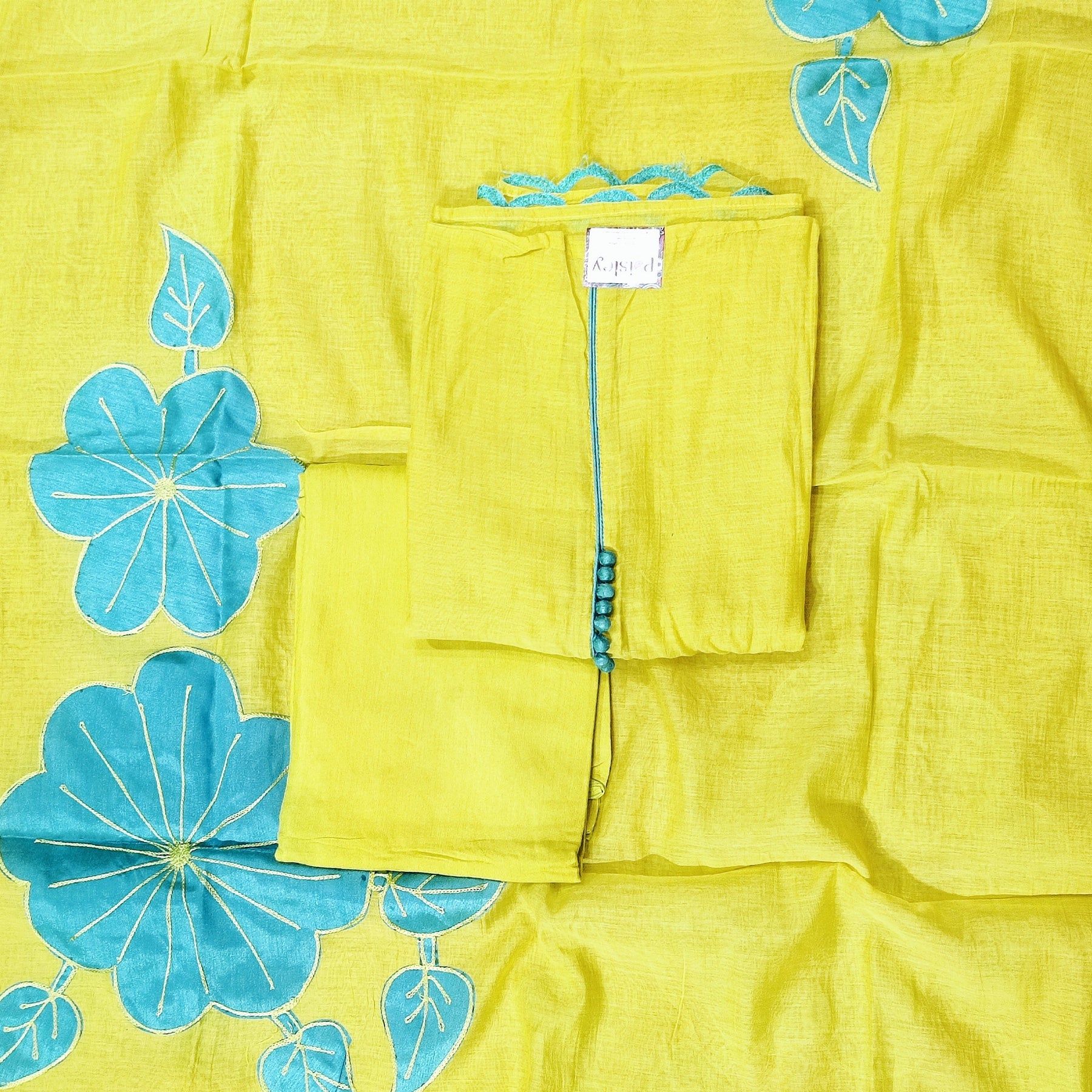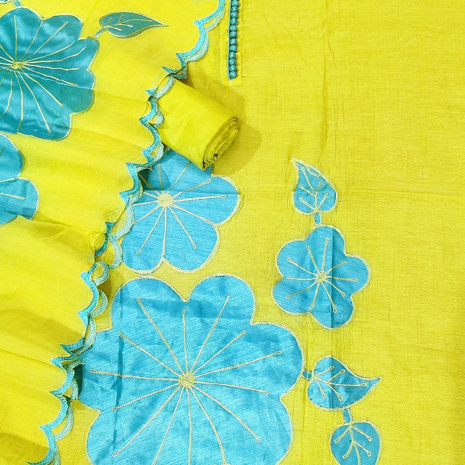 Neon Green Base Firozi Applique Work On Kurta And Dupatta Full Suits Set