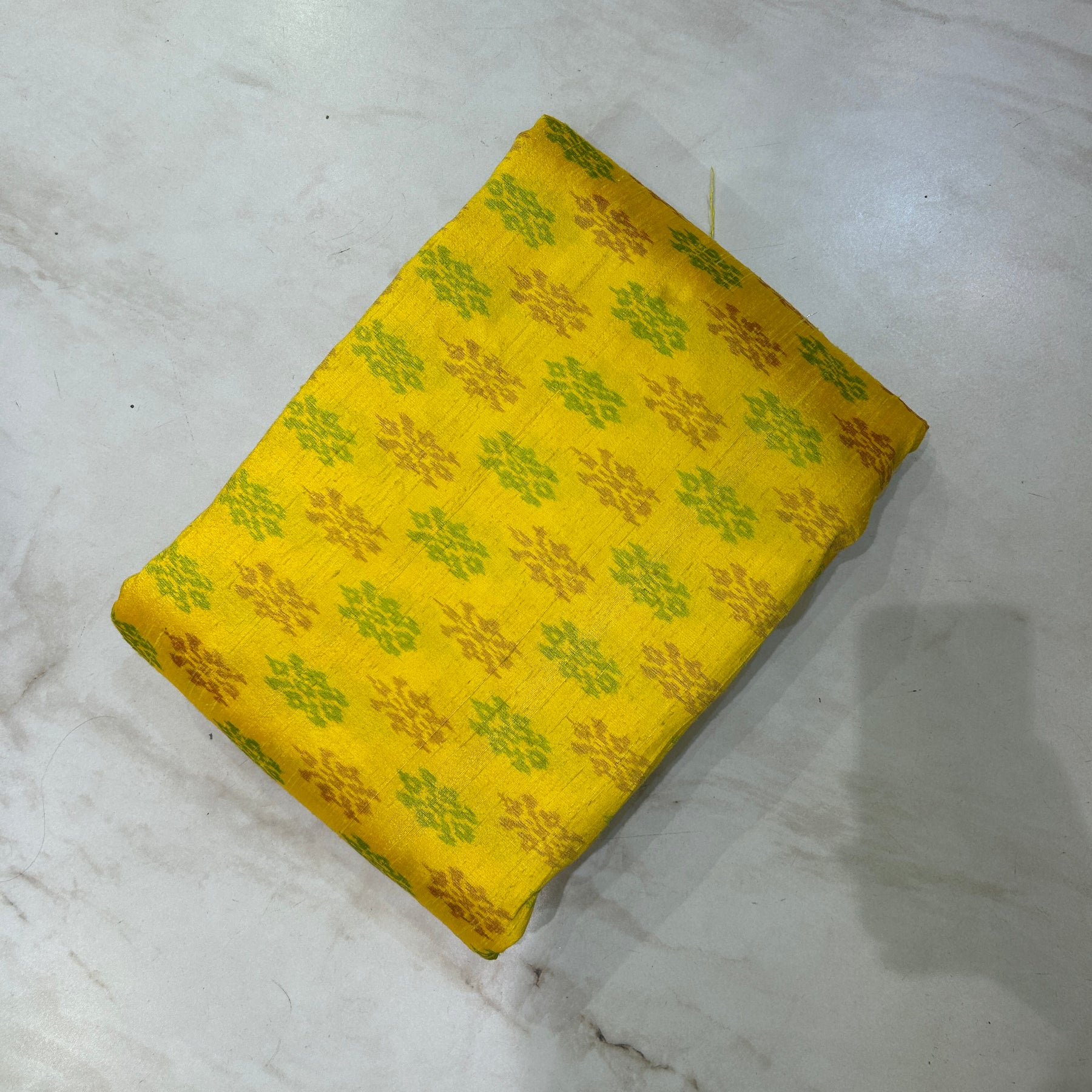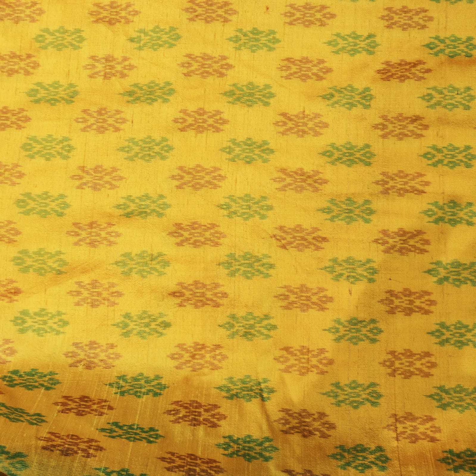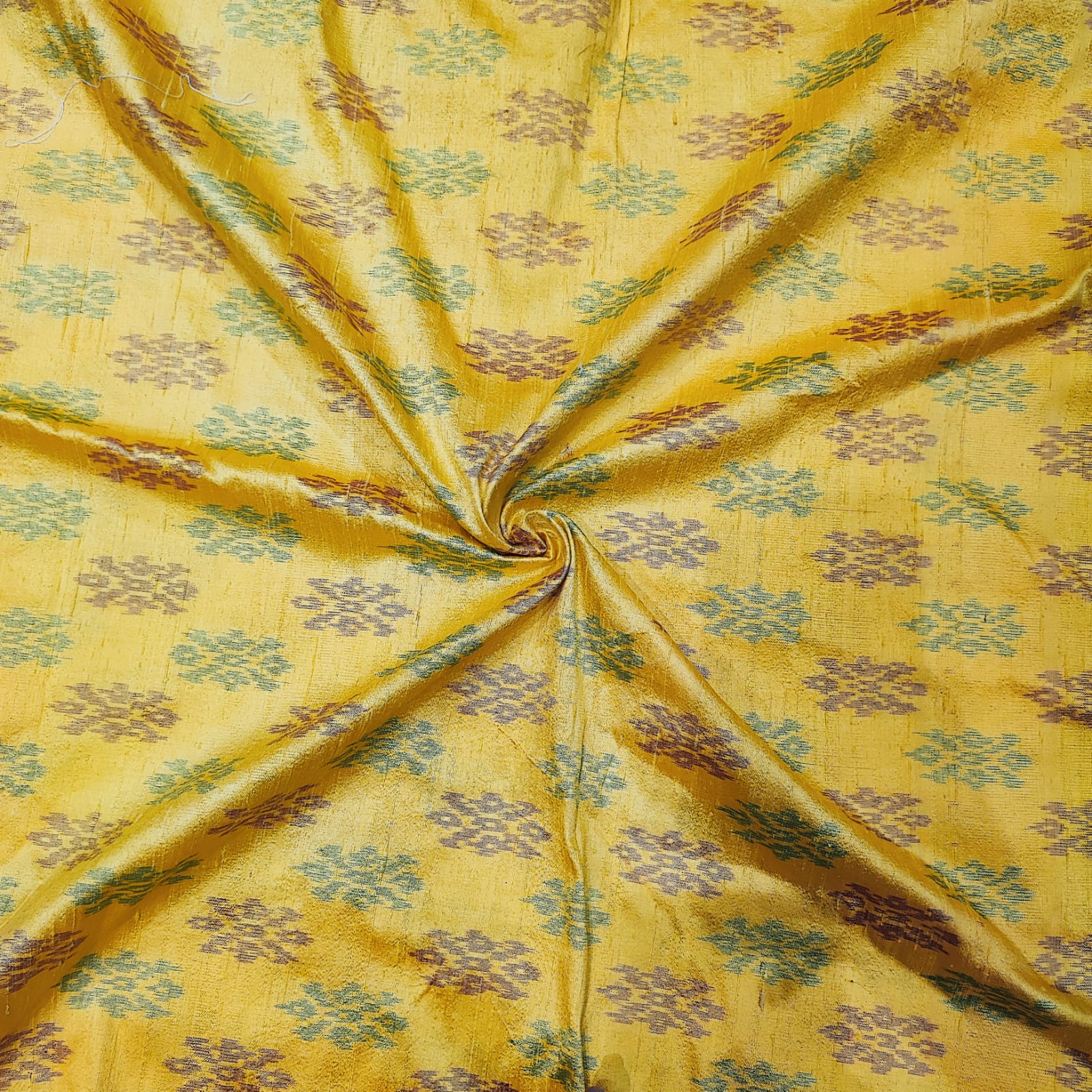 Bright Yellow Base Ikat Weave On Pure Raw Silk Fabric