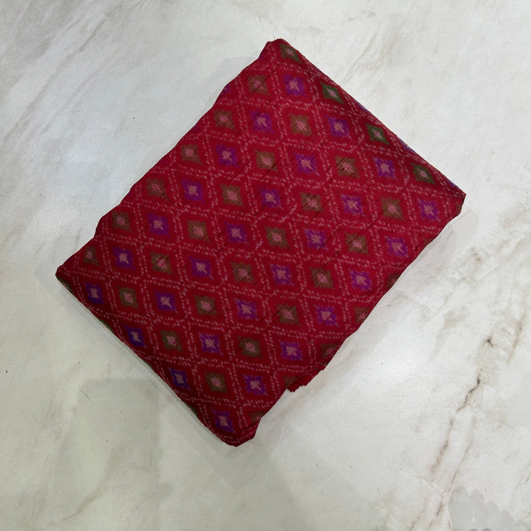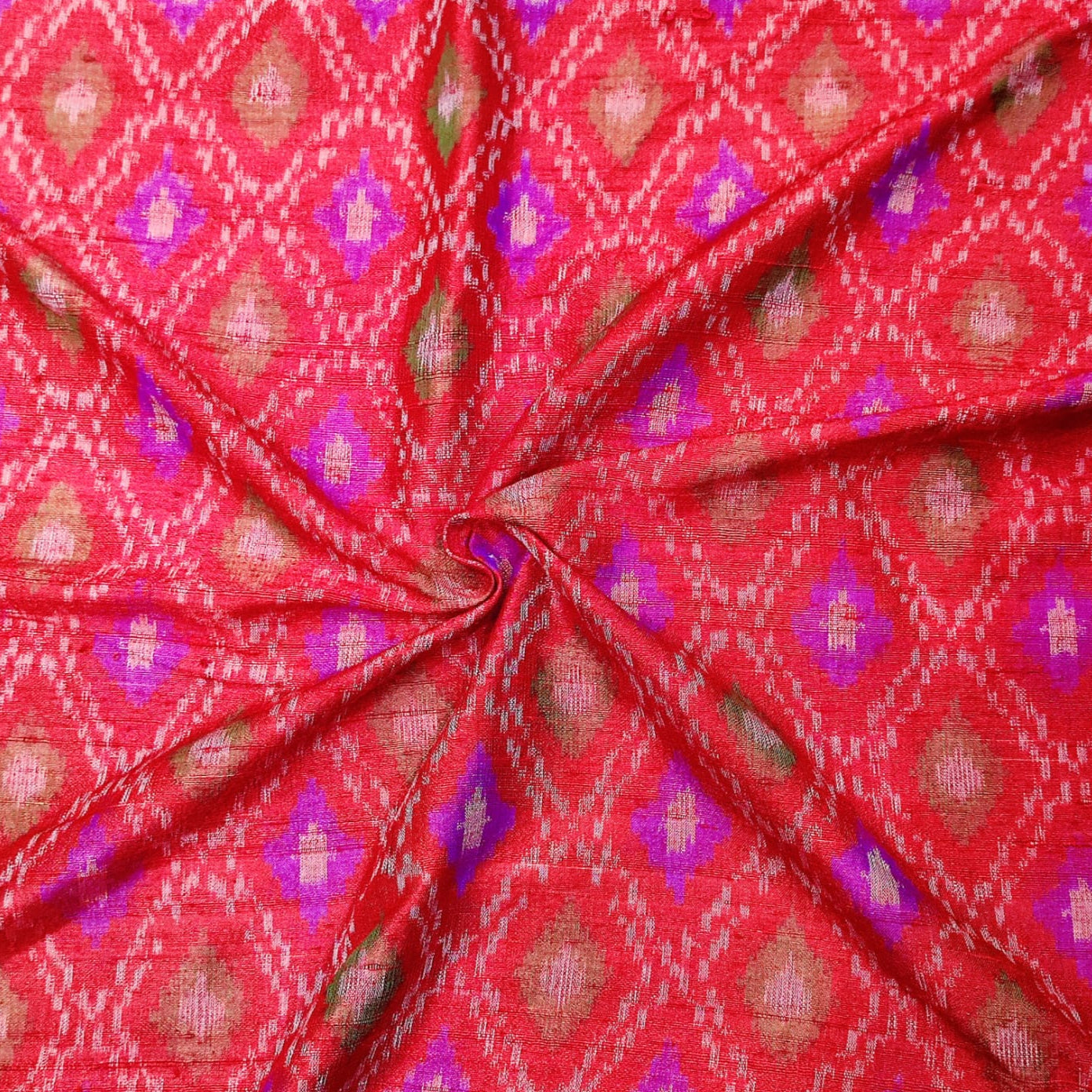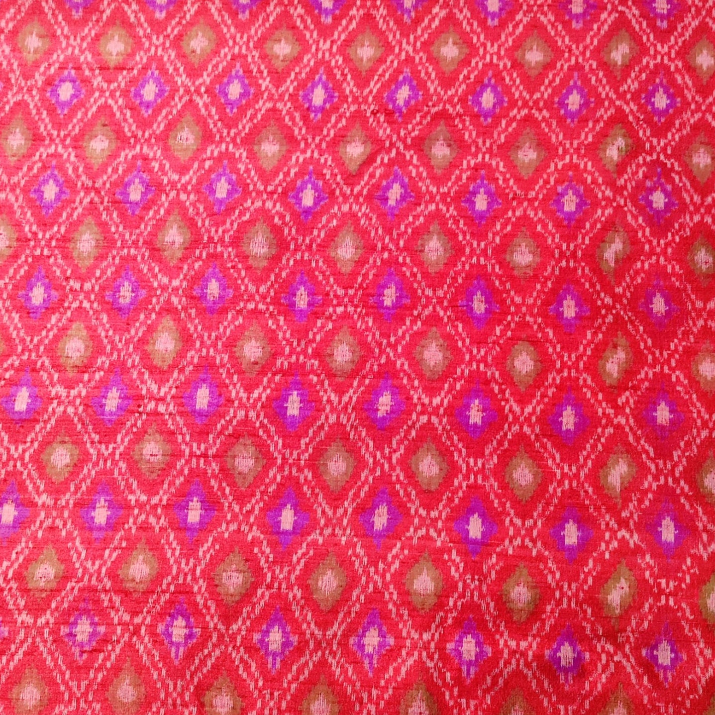 Maroon Base Ikat Weave On Pure Raw Silk Fabric
