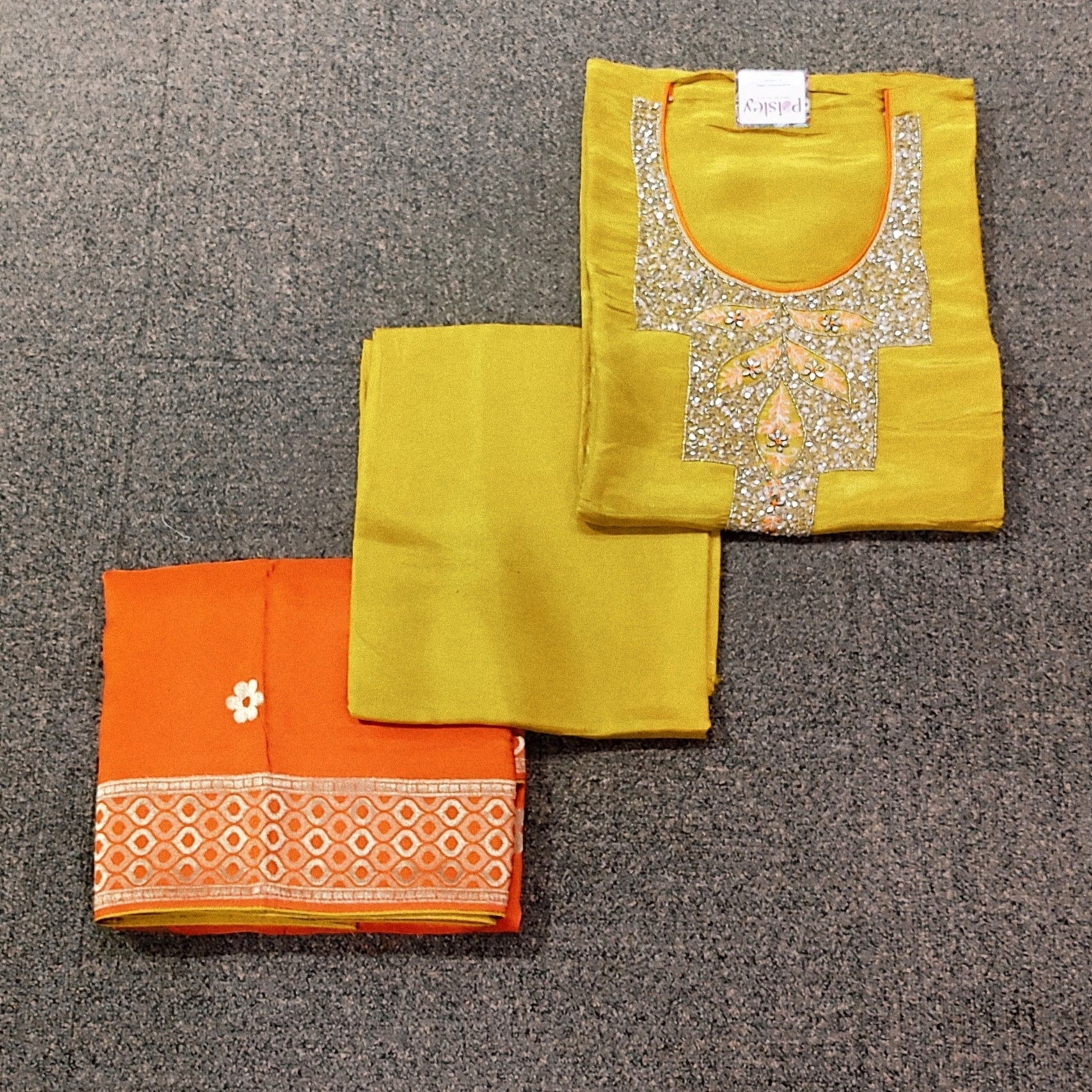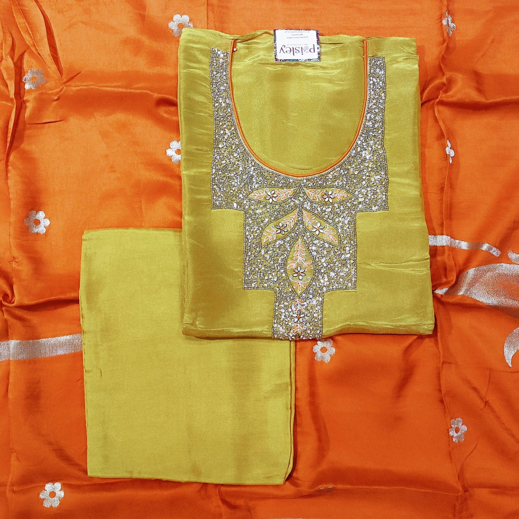Yellow Base Handwork On Kurta With Orange Dupatta Full Suits Set